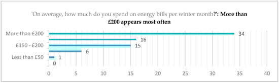 Participants’ average monthly energy bill expenditures were requested, giving an insight into how they manage their energy costs. Since the survey was conducted in 2022 during the cost-of-living crisis, it allowed for capturing the potential impact of rising energy prices on participants’ expenses. It is worth noting that there was no access to actual billing data to verify these claims. The data provided by participants were based on their recall of the last year prior to this study. The findings reveal a variety of respondents’ purchasing patterns (Figure 4). Only a small percentage (1.4%) projected monthly energy expenses of under GBP 50. A proportion of 8.3% of participants had an average budget of between GBP 50 and 100. While a sizable number (22.2%) budgeted between GBP 100 and 150 per month for energy costs, 20.8% of respondents said they spent between GBP 150 and 200. Meanwhile, the majority (47.2%) reported paying more than GBP 200 in energy bills per month, which, in light of the significant proportion of people with low incomes, is deemed excessive. Participants’ reported energy use and household income show a strong correlation.