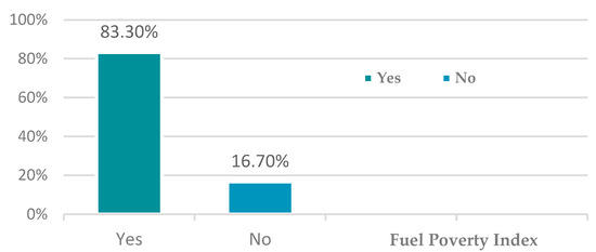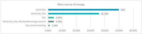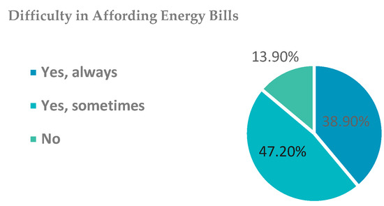 Participants were also questioned about the energy sources they utilised at home. The findings include information on the prevalence of various energy sources, which may be related to fuel poverty factors. With 50.0% of respondents using them, Figure 5 shows how electricity emerged as the most popular energy source. A lower percentage (4.2%) of users said gas was their main energy source. It is interesting to note that 4.2% of respondents said they used electricity, gas, and renewable energy sources all at once. A proportion of 36.1% of respondents mixed gas and electricity, indicating a typical energy mix. No participant stated that they only used renewable energy. A small percentage of respondents (1.4%) combined gas and district heating. Similarly, 4.2% utilised both district heating and electricity. These results shed light on the dominant energy sources used by the sampled population, highlighting the dominance of electricity and the sporadic use of district heating and renewable energy.