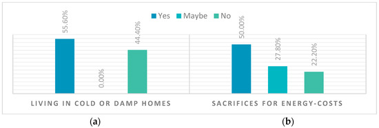 The inefficient energy performance of buildings stands out as a key driver of fuel poverty [25]. Healthy housing, as defined by the World Health Organisation [26], encompasses defence against the elements, excessive moisture, pollutants, mould, and pests. Residing in cold, unmaintained dwellings not only increases the likelihood of illness [23] but also induces stress due to discomfort and financial concerns, negatively impacting occupants’ well-being [27] and making poor users resort to alternative heating methods, such as using ovens, due to heating system inadequacies, reflecting the dire state of the buildings.