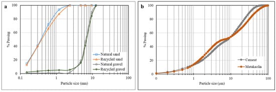 Table 2 shows the chemical analysis of powders and recycled aggregates, and Table 3 shows the physical properties of natural and recycled aggregates. Figure 2a,b shows the particle size distributions of the aggregates and powders, respectively.