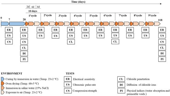 Mechanical and durability properties were assessed using non-destructive tests (electrical resistivity and ultrasonic pulse velocity) and destructive tests (axial compressive strength, chloride penetration depth, chloride ion diffusion, and physical indices). The non-destructive tests were carried out at 7 and 28 days of submerged curing and the end of each cycle (Figure 3). Destructive tests were also carried out at 7 and 28 days of submerged curing and the end of the last cycle, except for the chloride penetration depth test, which was also conducted at the end of the 3rd and the 6th cycles. Figure 3 illustrates a schematic flowchart summarizing all the tests carried out on the SCC mixtures under study, their respective ages, and their deterioration cycles.