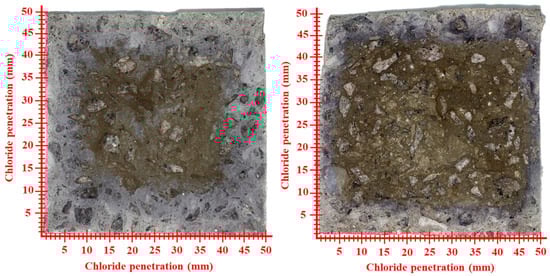The cubic SCC specimens (Type B test specimens) were submerged in water for 28 days and then exposed to the aggressive cycles. After the cycles, at the ages indicated in the flowchart (see Figure 3), the specimens were broken transversely in the direction of the open faces. Afterwards, a 0.1 M silver nitrate (AgNO3) solution was sprayed onto the specimen’s surface. Chloride ions present in the specimens react in the presence of silver nitrate, forming a precipitate of silver chloride (AgCl). The precipitation appears as a white region when it is wet and turns purple after the solution dries (Figure 4). With the aid of a digital caliper, it was possible to measure the depth of chloride ion penetration for each specimen.