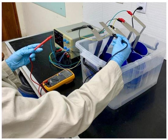 According to the recommendations of the NBR 5739 standard [], three cylindrical samples were tested for each age at 7 and 28 days for wet curing and at 118 days, with and without a wetting and drying cycle, in chloride water. The results were obtained by averaging the strengths of the three samples.