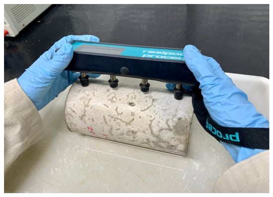 The measurement of the ultrasonic pulse velocity (UPV) in concrete was carried out according to the NBR 8802 standard [] with the assistance of Pundit Lab+ equipment, manufactured by Proceq SA, using two 54 kHz ultrasonic wave transducers with 0.1 μs resolution. The test was conducted on cylindrical samples (Type A test specimens) at 7 and 28 days of age and at the end of each exposure cycle. The test was conducted on both the samples exposed to the air and the samples subjected to Cl− attack. The results were obtained by averaging the readings from three samples of each SCC mixture.