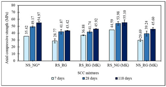 Figure 8 shows the evolution of the axial compressive strength of the studied SCC mixtures. When comparing the RS_RG mixture with the reference mixture (NS_NG*), the compressive strength was reduced by 18.8% at 7 days, 14.9% at 28 days, and 21% at 118 days. This reduction has been widely reported in the literature [,,,,,,,,], since the CDW aggregate exhibits greater fragility and heterogeneity, and the layer of old mortar adhered to the grains of the recycled aggregates (RS and RG), increasing the porosity of the concrete. Furthermore, there is a greater network of pores in the microstructure of the recycled aggregates, and their use in concrete weakens the bond between the old interfacial transition zone (ITZ) and the new ITZ, leading to a compromise in the mechanical properties of the concrete. The compressive strength reduction attributed to the use of recycled aggregates is compensated for by the filler effect and pozzolanic reaction of MK. Previous studies have shown that the addition of MK helps to compensate for the loss of strength in SCC with the incorporation of recycled aggregates from construction waste [,]. Although the recycled CDW aggregate is more porous than the natural aggregate, when concrete containing recycled aggregates is prepared using MK, there is an improvement in the bonding of the ITZ between the paste and the aggregates []. The NS_RG (MK) mixture achieved a compressive strength similar to the RS_RG (MK) mixture, while the RS_NG (MK) mixture exhibited a compressive strength similar to the reference (NS_NG*), reaching 55.10 MPa at 118 days of age. This may be associated with the filling of the SCC’s pores, which occurred due to both the addition of MK and the content of powdered material present in the RS.