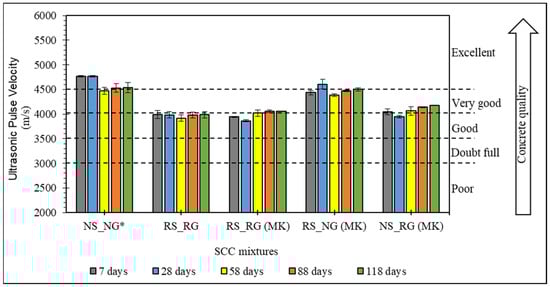 As shown in the graph in Figure 9, the ultrasonic pulse velocity (UPV) decreased with the incorporation of recycled aggregates into the SCC, albeit insignificantly. When comparing the RS_RG mixture with the reference mixture (NS_NG*) under submerged curing at 28 days and exposure to air in the following days, the UPV decreased by approximately 13.9%, considering the low variation in results over time. The reduction in UPV in the RS_RG mixture, similar to what happened with mechanical strength, occurred because of the increased porosity of the SCC with CDW aggregates due to the layer of mortar adhering to the grains and the greater porosity of the recycled coarse aggregate. Similar results were observed in other studies [,,,]. In addition to porosity, Kapoor et al. [] stated that other parameters can affect UPV, such as the water–cement ratio and the concrete saturation level during testing. The UPV results for the RS_RG, RS_RG (MK) and NS_RG (MK) mixtures were similar at all ages. The RS_NG (MK) mixture achieved results similar to the reference mixture (NS_NG*), as shown in Figure 9. This highlight was also observed in the compressive strength result mentioned earlier, demonstrating that the porosity of the coarse aggregate was primarily responsible for the decrease in strength, as all SCCs with recycled CDW gravel showed the same UPV.
