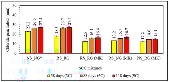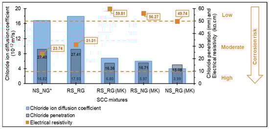 Figure 14 summarizes three durability indices of SCC mixtures (chloride ion penetration depth, chloride ion diffusion coefficient, and electrical resistivity). It can be observed that these indices are directly correlated. The RS_RG (MK), RS_NG (MK), and NS_RG (MK) mixtures showed low risks of corrosion in terms of electrical resistivity, high resistance to chloride ion penetration (6.80, 5.97, and 3.99 × 10−12 m2/s, respectively), and under these highly aggressive conditions, chloride ions do not penetrate beyond the minimum cover thickness (20 mm) for reinforced concrete structures.