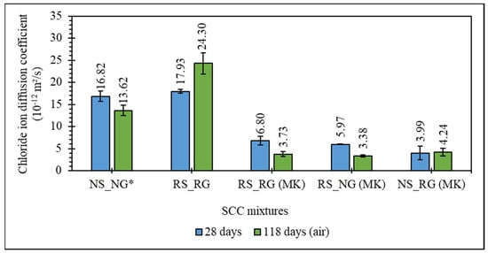 Figure 11 shows the chloride ion diffusion coefficients in SCC mixtures exposed to the open air at 28 and 118 days. With advancing age, there was a reduction in Cl− diffusion, attributed to the filling of pores with the formation of more hydration products, except for the RS_RG mixture, which increased Cl− diffusion due to its greater porosity compared to the other mixtures. At 28 days, the NS_NG* and RS_RG mixtures exhibited similar results. The addition of MK resulted in a decrease in Cl− diffusion, as can be observed in Figure 11. At 118 days, the RS_RG (MK) mixture reduced the diffusion by 84.6% compared to the RS_RG mixture. The use of MK reduces chloride diffusion and increases the percentage of Cl− ions dissolved in the interstitial water. The chloride diffusion coefficients of the RS_NG (MK) and NS_RG (MK) mixtures were similar to those of the RS_RG (MK) mixture. The isolated or combined use of recycled sand and recycled coarse aggregate (RS and RG) did not have a significant effect on Cl− diffusion when using MK.