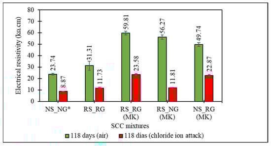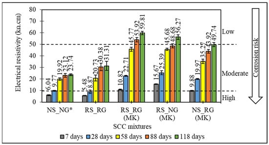 - The electrical resistivity was slightly higher in the SCC mixture with recycled aggregates than in the SCC mixture with natural aggregates (reference) at 118 days of age. The addition of MK significantly increased the electrical resistivity of the SCC mixtures containing recycled aggregates. The electrical resistivity of the mixtures decreased after the aggressive chloride attack. SCC mixtures that incorporated recycled fine and coarse aggregates separately remained in the moderate corrosion risk range.