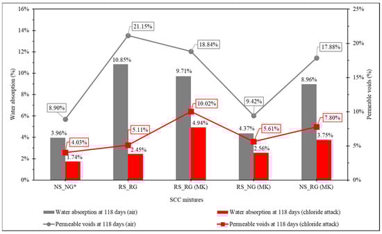 Figure 15 presents the results of water absorption by immersion and void index for SCC mixtures at 118 days when exposed to air and subjected to chloride attack cycles. There was a considerable increase in water absorption (174%) and in the void index (138%) for the RS_RG mixture when compared to the reference mixture (NS_NG*). This increase was expected, as the porous structure of the recycled aggregates (RS and RG) promotes increased water absorption in concrete. With the addition of 10% MK to RS_RG mixture, there was a 10.5% reduction in water absorption, and the void index decreased by 10.92% when compared to RS_RG mixture, both at 118 days of exposure to open air. The benefit of using MK in concrete durability properties can be attributed to the filler effect. The particles of MK are smaller than cement particles, thus filling the voids in the concrete microstructure and making it more impermeable.