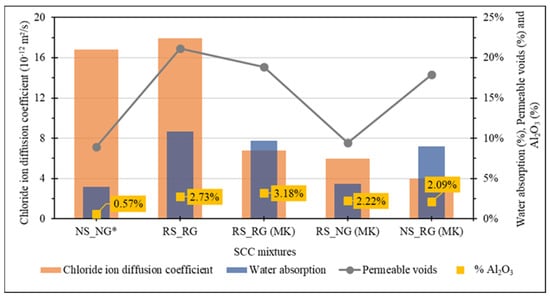 Figure 16 displays the correlation between the chloride ion diffusion coefficients, Al2O3 contents, water absorption, and void indices of the studied SCC mixtures. The content of alumina (Al2O3) in the mixtures mainly came from metakaolin and the recycled aggregates, but the portion from metakaolin consisted of reactive alumina. In addition to the direct correlation between water absorption and void index, it can be observed that the higher the amount of reactive alumina in the mixture, the lower the chloride ion diffusion, as seen in the results of the RS_RG (MK), RS_NG (MK), and NS_RG (MK) mixtures.