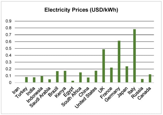 - Electricity Prices Around the World. Available online: https://www.globalpetrolprices.com/electricity_prices/ (accessed on 16 December 2023).