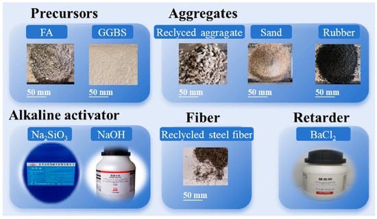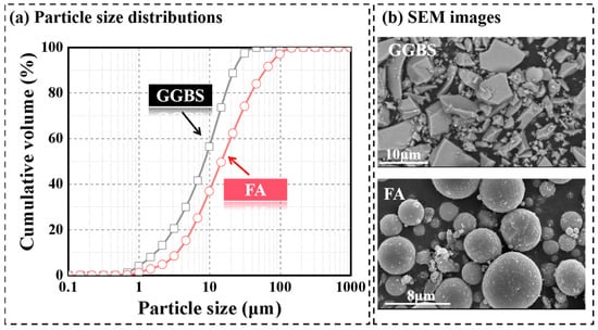 The raw materials used in this paper are shown in the macroscopic morphology images in Figure 1 and are mainly divided into precursors, aggregates, alkali activators, fibers and a retarder. The precursors included FA (Class F) and GGBS (S95), with their particle size distribution and microscopic morphology under scanning electron microscopy (SEM) shown in Figure 2. Additionally, X-ray diffraction (XRD) patterns of the precursors are shown in Figure 3. And the chemical compositions of the FA and GGBS were determined using an X-ray fluorescence (XRF) test, the results of which are shown in Table 1. The alkaline activator was a mixture of sodium hydroxide (SH) and sodium silicate (SS). The SH was sourced from Xilong Scientific Co., Ltd. (Shenzhen, China) and was a white, uniformly granular solid with a purity of ≥96.0%. (NaOH). Detailed parameters of the SS are listed in Table 2. Note that the alkali-activated solution was prepared by mixing a pre-prepared SH solution with SS. The molarity of the SH solution was 10 mol/L.