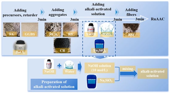 The preparation process of RuAAC is shown in Figure 5. The preparation of RuAAC in this study used a forced mixer with a mixing speed of 48 r/min. Before mixing, the mixer was wetted with water. To ensure uniform mixing of binder materials and aggregates, FA and GGBS were first added and mixed for 3 min. RCAs, RS and CR were then added and mixed for another 3 min. The alkali-activated solutions were added and stirred for 3 min to form a homogeneous alkali-activated mortar. Finally, fibers were slowly added and stirred for 3 min to ensure even dispersion. The freshly mixed RuAAC was poured into molds, placed on a vibrating table, and compacted using a tamping rod simultaneously with vibration. After compaction, the surfaces of the specimens were smoothed. Finally, a thin plastic film was placed over the specimens to avoid water evaporation. All the specimens were demolded and subsequently underwent preservation in room for 24 h. The specimens were cured by sprinkling water on them for 27 d until formal tests were conducted.