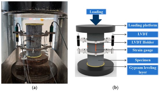 Test equipment for a static axial compression test is shown in Figure 6. As per ASTM C469 [], a static axial compression test was conducted on cylindrical specimens using a testing machine with a maximum capacity of 4000 kN. Initially, gypsum was used to level the top and bottom of each specimen to avoid loading eccentricity. Four 50 mm strain gauges were attached to each specimen’s surface to obtain axial strains and hoop strains. Meanwhile, two symmetrically placed linear variable differential transformers (LVDTs) with a gauge length of 80 mm were adopted to obtain axial deformation at mid-height of the specimens. In order to obtain complete stress–strain curves, a displacement loading mode with a rate of 0.12 mm/min was applied. Displacement, axial strain, hoop strain and force were acquired simultaneously using a TDS-530 high-speed static strain gauge with a data acquisition frequency of 1 Hz.