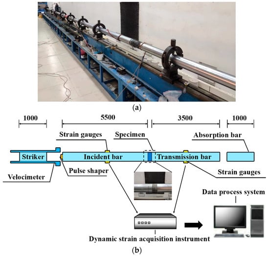 Test equipment for SHPB test: (a) test setup; (b) schematic diagram.