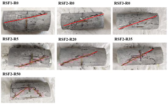 With increases in RSF and CR contents, the main crack angle of the specimens increased, leading to diagonal shear failure accompanied by multiple diagonal cracks, which was consistent with the test results from Chen, et al. []. In particular, when the CR content increased to 50%, the surfaces of the specimens were filled with diagonal cracks, indicating the enhanced deformability and ductile failure of the RuAAC. The augmented ductility could be interpreted via reduced flowability, increasing voids with CR incorporation, as well as poor bonding between the matrix and CR []. Additionally, as shown in Figure 8, cracks traversed the entirety of the specimens, with some protrusions in the middle but no spalling. This may be attributed to the effective bridging effect of the RSFs, which suppressed the number and width of cracks, preserving the integrity of the specimens.