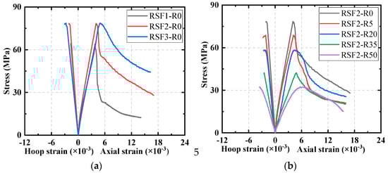 Figure 9 shows representative stress–strain curves for different RSF and CR contents. From Figure 9a, it can be observed that the peak stress of the concrete increased as the RSF content increased. The slope of the ascending branches of the curves show no clear pattern of change, while the descending branches become more moderate, indicating that RSFs could improve both the strength and ductility of RuAAC. This may be related to the inhibition effect of RSFs on crack propagation. Due to the bridging effect of RSFs, the lateral deformation of the RuAAC was constrained, leading to delayed failure and increased peak stress. The toughening effect of RSFs has been observed in previous studies, consistent with the results of this research []. It is worth noting that the toughening effect may be slightly lower than that of SFs due to the varying lengths of RSFs, as demonstrated in other studies [,].