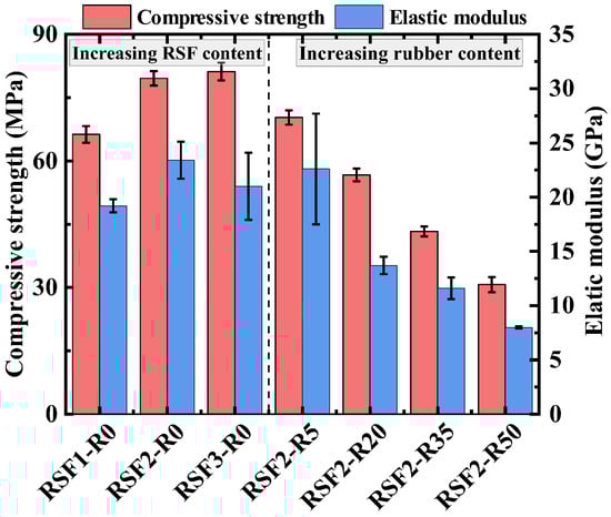 The results of the static axial compression test are presented in Table 6. Figure 10 shows the effect of different RSF and rubber contents on the static axial compressive strength and elastic modulus of the RuAAC. It could be seen that among all mix proportions, RSF3-R0 reached the highest strength (81.2 MPa). The axial compressive strength of the RuAAC continuously increased with the increase in the RSF content but decreased continuously with the increase in the CR content. As mentioned before, the main reason for this may be that CR has much lower mechanical properties than RS and a poorer rubber–matrix bonding interface. Moreover, the addition of rubber increased the internal pores in the concrete, weakening its compressive strength. The bridging effect of RSFs within the matrix constrained the lateral deformation of the concrete, improving its bearing capacity and ductility. This indicated that the bridging effect of RSFs could compensate for the negative impact of CR on compressive performance to some extent.