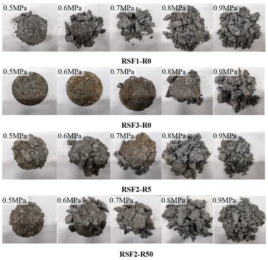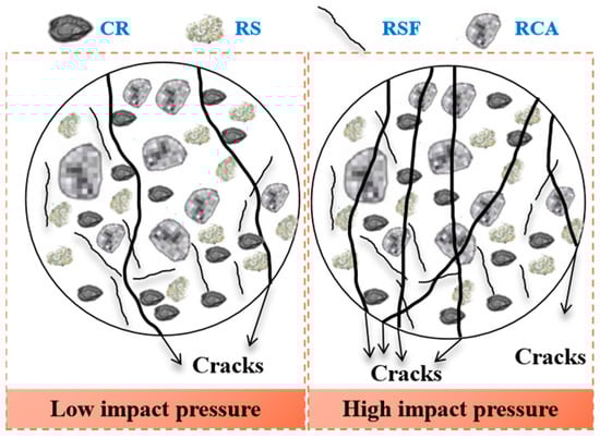 Figure 11 presents the failure modes of the RuAAC at various impact pressures. From Figure 11, it can be observed that the damage to the RuAAC samples with different RSF and rubber contents became more severe with increasing impact pressure. The RuAAC only exhibited a few microcracks, staying relatively intact under low impact pressure, while the RuAAC was completely destroyed and presented a powder-like or fine-chunk state under high impact pressure. Additionally, it can be seen from Figure 11 that the integrity of the RuAAC at the same impact pressure was greater with an increasing RSF content, indicating that RSFs can enhance impact resistance. Similarly, the integrity of the RuAAC specimens also improved to some extent when the rubber content increased. In short, when subjected to impact loading under similar impact pressures, the impact performance of RSF2-R5 was superior to RSF2-R50, with greater integrity. The higher the bridging effect provided by RSFs, the greater the integrity of the RuAAC. With a greater RSF content, the RuAAC had higher strength and maintained greater integrity. It was worth noting that the extent of RuAAC damage may also be related to the size of the RSFs, since these types of fibers are irregular in length and shape, which may result in different toughening effects on concrete. Additionally, adding CR particles to the RuAAC helped improve its crack resistance ability. When cracks began to propagate toward the center of the specimens, CR played a role in inhibiting crack expansion. The slowing down of the crack propagation rate can be interpreted as the energy dissipation of CR under impact loading. The mechanism allowed the CR to effectively absorb and mitigate the effect of sudden impacts.