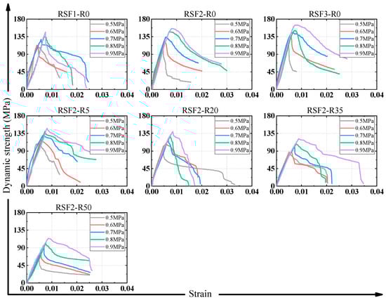 Figure 12 illustrates the dynamic stress–strain curves of RuAAC samples with varying contents of RSF and CR under different impact pressures. From Figure 12, it can be observed that the dynamic stress–strain curves of the RuAAC can be divided into ascending and descending branches. First, the curves gradually rose, starting to descend after reaching peak stress. With increasing RSF and CR contents, the descent of the curves became more gradual. At different impact pressures, there was no clear pattern in the rising segments of the curves, but the peak stress was significantly increased, indicating a noticeable strain rate effect in the RuAAC. When the RSF content increased, the peak stress significantly increased, with the slope of the rising segments of the curves slightly increasing, while the falling segments became more gradual. On the other hand, when the rubber content increased, the peak stress decreased, with the slope of the rising segments of the curves slightly decreasing, while the falling segment remained relatively smooth. This indicates that both RSFs and rubber particles delayed the development of cracks and the ultimate failure, demonstrating a significant synergistic toughening effect. Although the SHPB test results for RuAAC are relatively limited, these observations are generally consistent with the strain rate effect observed in previous studies on rubberized AAC [,,].