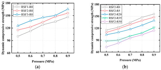 Influence of different levels of impact pressure on dynamic compressive strength: (a) RSF content; (b) rubber content.