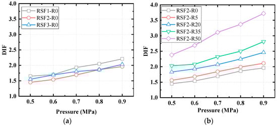 Influence of different levels of impact pressure on DIF: (a) RSF content; (b) rubber content.