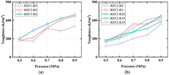 Influence of different levels of pressure on toughness: (a) RSF content; (b) rubber content.