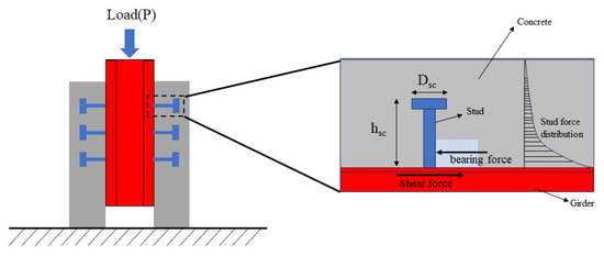 Considering the effect of reinforcement in concrete slabs is crucial, as it is related to the concrete failure mode and significantly influences shear capacity. Oehlers et al. [17] confirmed the significance of transverse reinforcement for controlling cracks in NSC, which can reduce the ultimate strength of stud connectors. Prakash et al. [18] considered the confinement ratio calculated using transverse reinforcement as a means to improve shear capacity, particularly for high-strength studs. Kumar et al. [19] examined the impact of reinforcement details.
