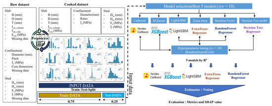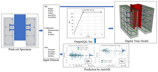 This study introduces the development of an augmented data-driven digital twin for stud shear connections. First, various elements comprising the shear connection are considered as input data and treated as parameters for strength prediction. Subsequently, a method is proposed to address the challenges of limited and biased datasets by utilizing the components of pushout tests as inputs to finite element models and their resulting ultimate strength values. This approach supplements the conventional data collection process by filling in information within relatively scarce and biased data ranges using finite element data. This mitigates the issues of underfitting or overfitting in ML models, caused by insufficient data, and compensates for the limitations of hard-to-obtain experimental data. Furthermore, this study introduces an ML prediction model based on experimental data related to deformation capacity. The model employs the AutoML approach using the PyCaret library (Python Library for Classification and Regression Train) [13], selects the five best models from various ensemble models, based on the decision tree model, and derives results through voting. This method reduces overfitting and model dependency, ensuring that future model improvements do not disrupt the overall framework. Through continuous data collection and ML model updates, this approach presents a stable procedure and suggests a process for replacing design codes. Therefore, a framework capable of continuous data collection and improved machine model acceptance is defined as a one-way digital twin at the design stage. A digital twin model predicts the ultimate states of the model based on input variables, using bilinear load–slip curves during the design phase. The overall process and flow of this study are as shown in Figure 2.
