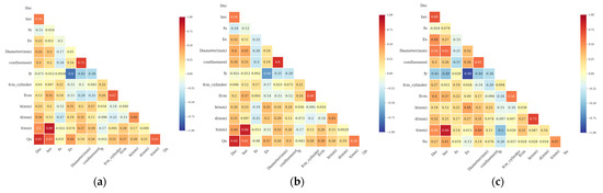 Correlation matrix of features in the dataset: (a) experimental dataset (strength); (b) augmented dataset (strength); (c) experimental dataset (slip).
