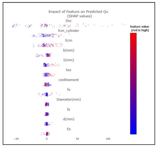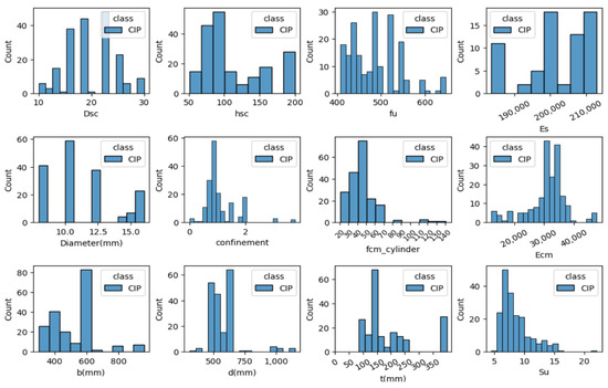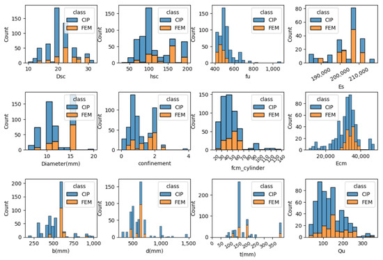 Data collection involved obtaining 431 records from experimental pushout tests, denoted as the pushout experimental dataset [1,3,14,15,16,20,23,25,26,27,28,30,68,69,70,71,72,73,74,75,76,77,78,79,80,81,82,83,84,85,86,87,88,89,90,91,92,93,94,95,96,97,98,99], and 139 records from the FEM, referred to as the FEM dataset [32,33,91,98,100,101,102,103,104]. The experimental dataset was specifically named as the “pushout experimental data,” while the combined set of experimental and FEM data was called the “augmented data.” The collected and preprocessed data comprised twelve features, organized into four input variables and one target variable. The input variables included the geometric dimensions of the concrete slab (b(mm), d(mm), t(mm)), the geometry-related values of the studs (Dsc, hsc), the configuration parameters of the internal restraints in the slab (confinement ratio and diameter), and the material properties of various components (tensile strength (fu) and modulus of elasticity (Es) of the stud, concrete modulus of elasticity (Ecm), average compressive strength of concrete cylinders (fcm), and yield strength of confinement reinforcement (fy)). The target variable was the ultimate shear strength (Qu) of the shear connection. Figure 4 shows the data distribution for each feature.