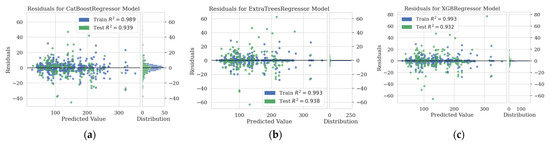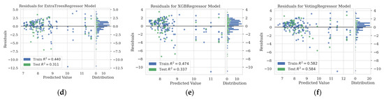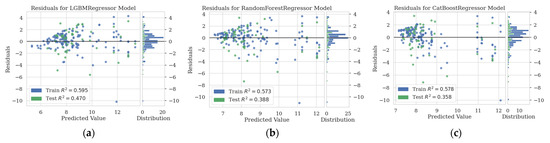 Considering the composition of a dataset, selecting a suitable model becomes an additional requirement, particularly when dealing with multiple features. In training a linear regression model on a dataset with many features, various problems can arise, such as the removal of features with a relatively low impact on the target feature or the risk of overfitting owing to an excessive fitting of features. In order to address these challenges, a model capable of handling datasets with many features and capturing nonlinear trends, such as decision-tree-based models, was selected from the models provided by PyCaret. The Decision Tree model offers a comprehensive and adaptable solution for classification and regression tasks. Its hierarchical tree structure, with internal nodes representing features, branches embodying decision rules, and leaf nodes culminating in predictions, facilitates an intuitive representation of decision-making processes. Central to the functionality of the decision tree is the selection of the splitting criteria at each internal node. This strategic decision, often based on optimizing information gain or minimizing variance, governs the partitioning of data and ultimately defines the structure of the tree. The PyCaret library supports six tree-based models: CatBoost, XGBoost, Random Forest, LightGBM, ExtraTrees, and Decision Tree. The top five models were selected, except the Decision Tree model.