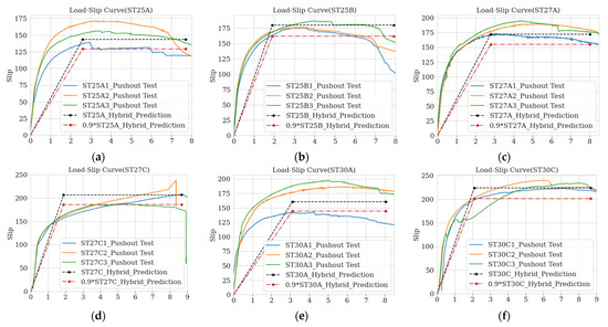 Data for the ultimate slip were collected from 194 pushout tests [1,15,16,20,22,23,25,28,69,78,80,81,82,83,84,87,90,91,92,93,97,98,99,105,106,107,108,109,110]. The target feature was the ultimate slip value (Su) of the shear connection. The ultimate slip values measured in the pushout experiments exhibited considerable variability. Various factors, including the criteria for assessing ultimate slip and deciding to terminate the experiments at different time points, influenced the determination of slip values. Consequently, the slip values provided may not necessarily represent the true ultimate slip values inherent to the actual specimen. Similar to the dataset for strength prediction, the experimental slip data comprised the dimensional and material values applied to typical specimens, as shown in Figure 5. Data on high-strength and large-diameter specimens are relatively scarce. Owing to the limited amount of data, confirming the overall correlation between the input features and slip was challenging. Nevertheless, the correlation coefficients among the features within the experimental data composition for slip prediction, as illustrated in Figure 3c, revealed that unlike strength, the thickness of the concrete slab and the height of the stud, which are related to stiffness, exhibited a directly proportional relationship with the ultimate slip.