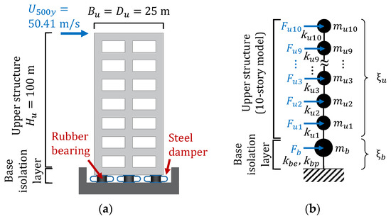 The base-isolated tall building considered in this paper (Figure 1a) was idealized into a theoretical shear-type MDOF model (Figure 1b). Its upper structure, with assumed dimensions of height ( denotes upper structure), width , and depth , is expressed using an elastic 10-degree-of-freedom model (herein viewed as a 10-story model). Its isolation layer, composed of rubber bearings and steel dampers, is expressed using an elasto-plastic SDOF model. More details about the MDOF model are provided in Section 2.1, Section 2.2, Section 2.3 and Section 2.4.