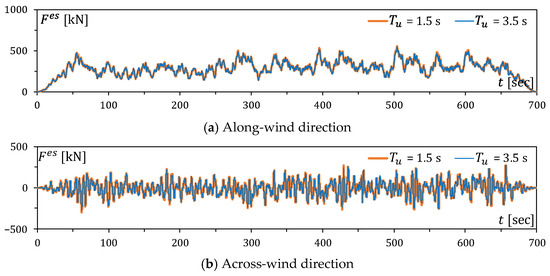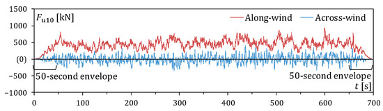 A total of 40 cases of wind forces (herein referred to as Force 01~40) in the along-wind and across-wind directions are considered in this paper [25,26]. As an example, Figure 2 shows the wind forces at the 10th story of the upper structure (Force 01), in which the along-wind direction has a mean component while the across-wind direction has none. Note that the first and last 50-s wind forces are envelopes used to avoid transient responses of the MDOF models in the time history analysis. Therefore, they are not considered in the calculation of the isolation-layer energy dissipation, as will be presented in Section 2.4.