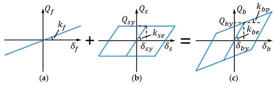 Shear force–deformation relationship: (a) rubber bearing (- relationship), (b) steel damper (- relationship), and (c) isolation layer (- relationship).