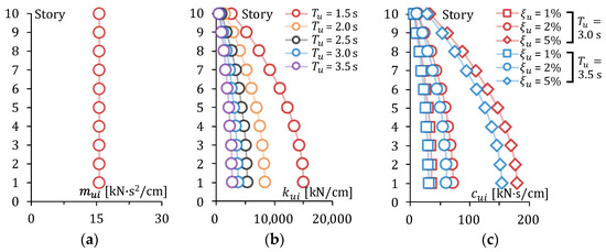 Figure 4a shows the mass distribution for the upper structure obtained from Equation (1). The masses of all stories have the same value, and they are not influenced by the above five structural parameters. Figure 4b shows the stiffness distribution for the upper structure obtained from Equation (2). The stiffness decreases with the story level for each value of , and the upper structure with a long shows a low stiffness. Among the five structural parameters, only has an influence on the stiffness distribution. Figure 4c shows the damping coefficient distribution for the upper structure obtained from Equation (3). For , the damping coefficient for the upper structure increases with an increasing . The same can be said for the other values of . Moreover, by comparing the damping coefficient for , the upper structure with a longer shows a lower damping coefficient. Overall, only and can influence the damping coefficient for the upper structure.