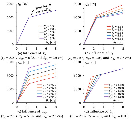 Figure 5a–d show the influences of the different structural parameters (, , , and ) on the shear force–deformation relationship of the isolation layer (- relationship) obtained from Equations (8)–(11). As indicated in Figure 5a, does not influence the - relationship since it is not used for calculating any parameter of the isolation layer. The same can be said for the influence of . As indicated in Figure 5b, has a small influence on both the elastic and plastic ranges. As increases, the initial stiffness decreases, leading to a decreasing yield shear force, and the post-yield stiffness also decreases. This is because the increase in results in a decrease in (Equation (5)), which then results in a decreasing (Equation (8)) and (Equation (9)). As indicated in Figure 5c, has a significant influence on the elastic range but none on the plastic range. As increases, the initial stiffness increases, leading to an increasing yield shear force, while the post-yield stiffness remains unchanged. This is due to the fact that an increasing with an increasing (Equations (6) and (7)) can lead to an increase in (Equation (8)). As indicated in Figure 5d, also has a significant influence on the elastic range but none on the plastic range. As increases, the initial stiffness decreases, leading to a large yield shear force and yield deformation. The reason for this may be related to Equations (7) and (8).