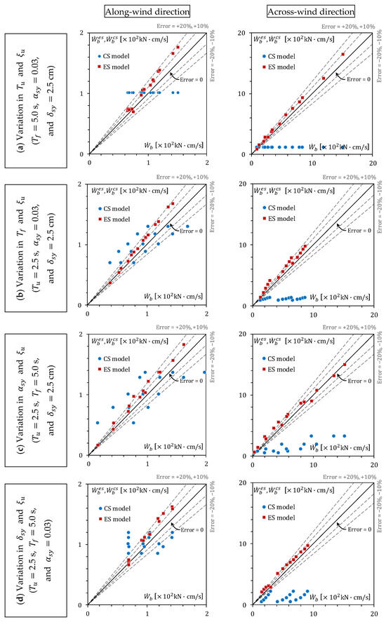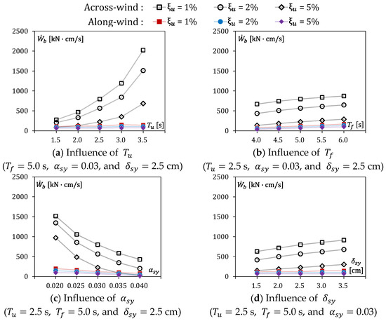 In the across-wind direction, increases significantly with the increase in , as shown in Figure 6a. For each value of , increases by more than 6 times as ranges from 1.5 s to 3.5 s. Although has no influence on the - relationship (Figure 5a), it influences the stiffness distribution for the upper structure (Figure 4b). It follows that the MDOF model with a soft upper structure (a long ) tends to have significant wind responses, including a large deformation of the base-isolation layer that results in a great amount of . In Figure 6b, in the across-wind direction increased slightly with the increase in . For , ranges from 670.2 kN·cm/s to 871.0 kN·cm/s for , from 434.5 kN·cm/s to 647.0 kN·cm/s for , and from 136.4 kN·cm/s to 298.6 kN·cm/s for . This slight trend in is attributed to the slight decrease in the initial and post-yield stiffness of the isolation layer with an increasing (Figure 5b). In Figure 6c, in the across-wind direction decreases significantly with the increase in . decreases by 71.8% for , by 85.1% for , and by 96.6% for , as increases from 0.02 to 0.04. This significant decrease is due to the significant increase in the yield shear force of the isolation layer with an increasing (Figure 5c), leading to difficulty in dissipating the wind-induced energy with the damper yielding. In Figure 6d, in the across-wind direction increases slightly with the increase in , which is similar to the trend observed in Figure 6b. The reason for this slight trend is that the isolation layer becomes soft in the elastic range by increasing (Figure 5d) so that the isolation layer can dissipate more wind-induced energy. Moreover, in the across-wind direction decreases significantly with the increase in as the other structural parameters (, , , and ) remain unchanged, as shown in Figure 6a–d. This is because the upper structure with a larger can dissipate more wind-induced energy, leading to less wind-induced energy that can be dissipated by the isolation layer. Summing up, in the across-wind direction, , , and show significant impacts on , which implies that a base-isolated tall building with a large , a large , and a small can easily produce a significant amount of . Therefore, structural designers should pay special attention to this aspect when conducting the wind-resistant design of base-isolated tall buildings. Furthermore, and show minor impacts on in the across-wind direction.