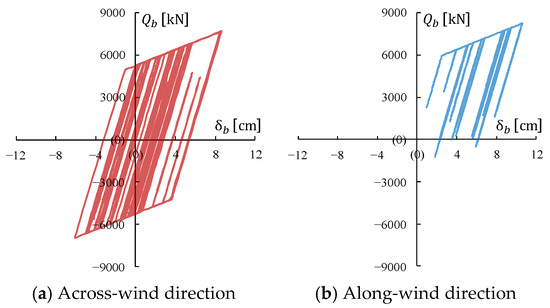 On the other hand, in the along-wind direction is significantly small and varies negligibly with increasing structural parameters (, , , , and ), as shown in Figure 6a–d. The reason for this can be explained by the - relationship for shown in Figure 7a,b. For a specific MDOF model (, , , , ), the - relationship in the along-wind direction (Figure 7b) shows much fewer and smaller hysteresis loops than those in the across-wind direction (Figure 7a). This is because the wind forces in the along-wind direction have mean components (Figure 2) in the direction, which leads to the fact that there is no large wind force in the direction and can make the isolation layer deform plastically in the direction. To sum up, the above five structural parameters show negligible impacts on in the along-wind direction.
