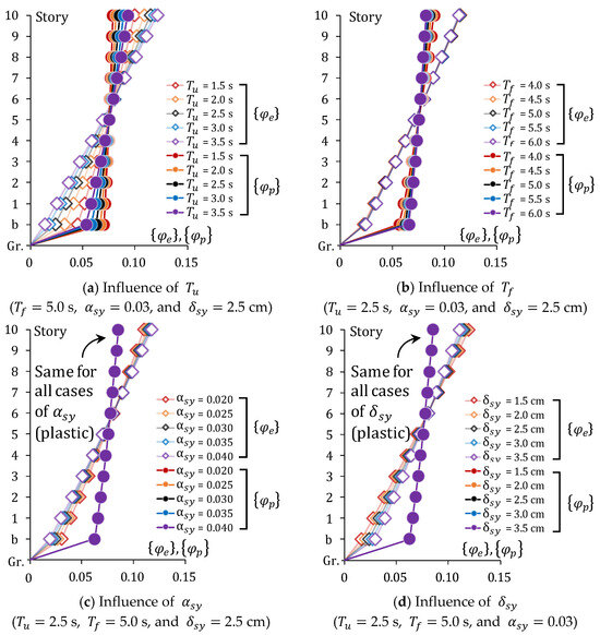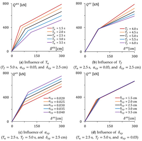 Figure 10a–d show the shear force–deformation of the ES model ( relationship) obtained from Equations (20)–(22) and (26) considering the different values of the structural parameters. As indicated in Figure 10a, influences both the elastic and plastic ranges because it influences and (Figure 8a), in contrast to its lack of influence on the - relationship (Figure 5a). Note that the - relationship is in accordance with the shear force–deformation relationship of the CS model (Equations (A2)–(A5) in Appendix A). As indicated in Figure 10b, has a negligible influence on the elastic range and a small influence on the plastic range due to its negligible impacts on and small impacts on (Figure 8b), respectively, which is similar to the - relationship (Figure 5b). As indicated in Figure 10c,d, and have small influences on the elastic range, which is different from the - relationship (Figure 5c,d), but none on the plastic range, which is similar to the - relationship (Figure 5c,d). This is because they have small impacts on and but none on .
