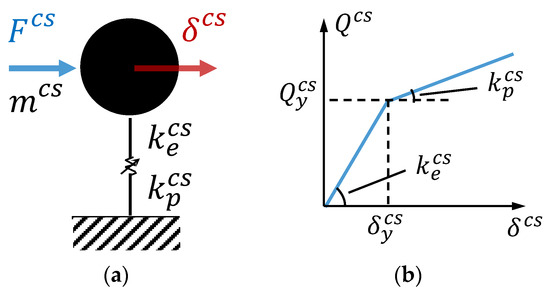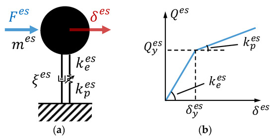 Figure 9a,b show the ES model and its shear force–deformation relationship ( relationship). According to Equation (18), the mass of the ES model in Figure 9a can be written as: