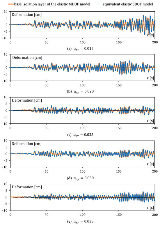 Examples of the deformation time history of the base isolation layer of the elastic MDOF model and the equivalent elastic SDOF model considering different values of (Force 02 in the across-wind direction and ) are shown in Figure A2a–e. Note that the displacement of the elastic SDOF model needs to be multiplied by the mode shape of the base isolation layer in the first mode shape of the elastic MDOF model. Here, the result of the equivalent elastic SDOF model is very similar to that of the elastic MDOF model at , suggesting that the elastic first mode shape is selected for the yield shear force of the ES model.