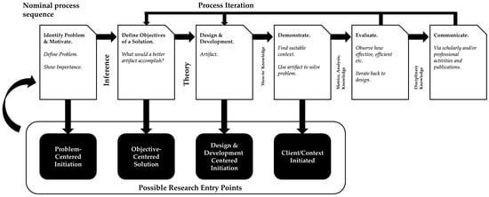 Within DSR, Design Science Research Methodology (DSRM) occurs using the principles or guidelines associated with this paradigm []. There have been various attempts to formalize methodology [,], though it differs across disciplines [,,]. For example, within Information Systems Research, Peffers et al. (2007) [] defined the Design Science Research Methodology (DSRM) as a six-activity process, as shown in Figure 1 and summarized as follows []: