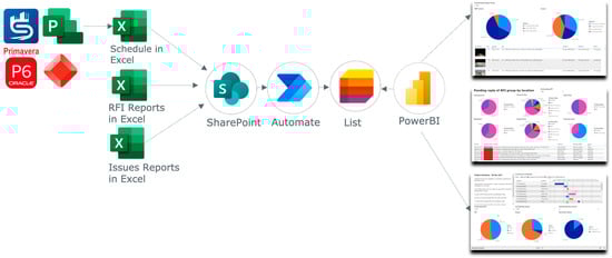 Digital dashboards can provide businesses with near-real-time updates using data visualization, which allows for easier and more efficient display of complex data []. This makes it easier for managers to understand key metrics and make informed decisions []. Web-based dashboards can be accessed from any location with an internet connection, allowing the relevant stakeholders to stay informed and make decisions on-the-go. They can be shared among team members, allowing for improved collaboration and transparency. Various researchers have discussed how digital dashboards, using project data analytics, can help manage construction projects [,,]. Areas in which digital dashboards are deemed useful here include: