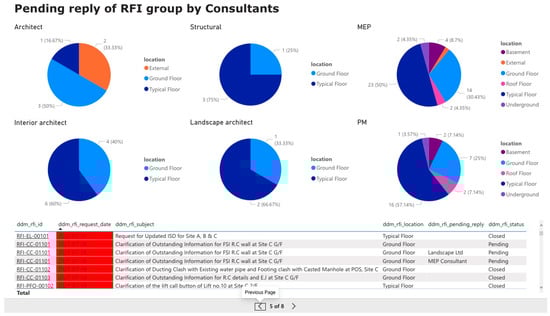 Typically, Technical Queries (TQs) at pre-construction stages (e.g., RIBA Stages 0–4) or site queries, in the format of Requests for Information (RFIs) during associated construction stages (e.g., RIBA Stages 4–5+), are generated by design consultants/others and can be issued in many different formats (e.g., by emails, typed word documents, handwritten memos, etc.). The key contents of these are then typically captured and aggregated via Excel-based registers by DM personnel. The DsDM web-based dashboard allows for the capture and collation of these TQs/RFIs. Summary reports appear in a project’s Common Data Environment (CDE), which hosts and visually presents key information from these queries for review, prioritizing, possibly onward routing, but ultimately addressing. However, the web-based dashboard does not just host conventionally created TQs/RFIs. On this project, the team also developed a new web-based form and associated cross-platform mobile app that allowed for electronic queries to be created ‘on the go’ (e.g., while on the jobsite) and uploaded to respective TQ/RFI schedules via ubiquitous computing tools such as a laptop computer or mobile cell phone device. Post-issue, an autogenerated email is sent to advise the Design Manager of new queries, who in turn can route these on to the best-placed project actor(s) to address the particulars. Using a programmed workflow to automate the task, total TQ/RFI data are ultimately synthesized within the respective schedules so that better management and control of all project TQs and RFIs occur. Figure 4 gives an indication of this, showing how, via analytics, RFI data are presented visually and therefore more meaningfully in the web-based dashboard, adding value to the design management process.
