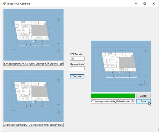 Similarly, via a stand-alone associated application also developed for this project, design managers can compare and contrast published design information in PDF formats to identify any differences between revisions that have not been explicitly flagged by their publishers. Therefore, this helps spot any hidden changes that have not been identified by conventional clouding/bubbling on PDF drawings, as indicated in Figure 7 and Figure 8.