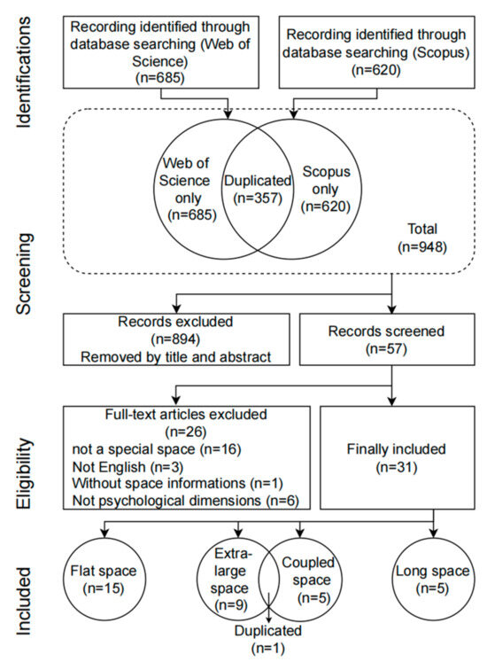 The screening process based on PRISMA is shown in Figure 1. The two databases of WOS and Scopus were selected for the search database, and after the screening of identification, screening, eligibility, and included, a total of 31 articles were obtained in this paper. The search criteria were: (1) Special-shaped spaces include the following four types: spaces whose lengths and widths are much greater than their heights but the variability between the length and width is small are known as flat spaces; spaces where the spatial acoustic field is a non-scattered acoustic field and the type of spaces with inhomogeneity of the acoustic field due to nonlinear energy attenuation are called extra-large spaces; spaces whose lengths are greater than six times their widths and heights are referred to as long spaces; and combinations of two or more spaces that are connected by coupling apertures are known as coupled spaces. (2) Functions were determined by spatial definitions such as office, transport, commercial, sports, exhibition, religion, etc., as shown in Table 1. (3) Subjective experiments were performed on the acoustic perception of the indoor spaces. (4) The evaluation dimensions, evaluation process, and evaluation results are included in the study. (5) Acoustic perception of performing arts functions was not considered. The eligibility for this study was reviewed by two reviewers in a non-blind review.