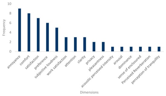 The method of characterising the subjects’ perception results is the perceptual dimensions. Figure 2 counts the frequencies of the 16 perceptual dimensions that appeared in the studies. The three dimensions with the highest frequency of occurrence were annoyance, satisfaction, and comfort, with frequencies of 9, 7, and 8 occurrences, respectively.